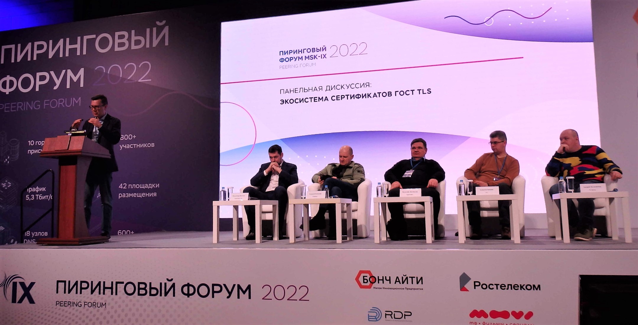 В рамках потока «Сетевые сервисы» прошла панельная дискуссия «Экосистема сертификатов ГОСТ TLS», модератором которой выступил генеральный директор ТЦИ Алексей Рогдев. В дискуссии также приняли участие представители Минцифры РФ, Сбербанка, НПК «Криптонит», VK и RU-CENTER.